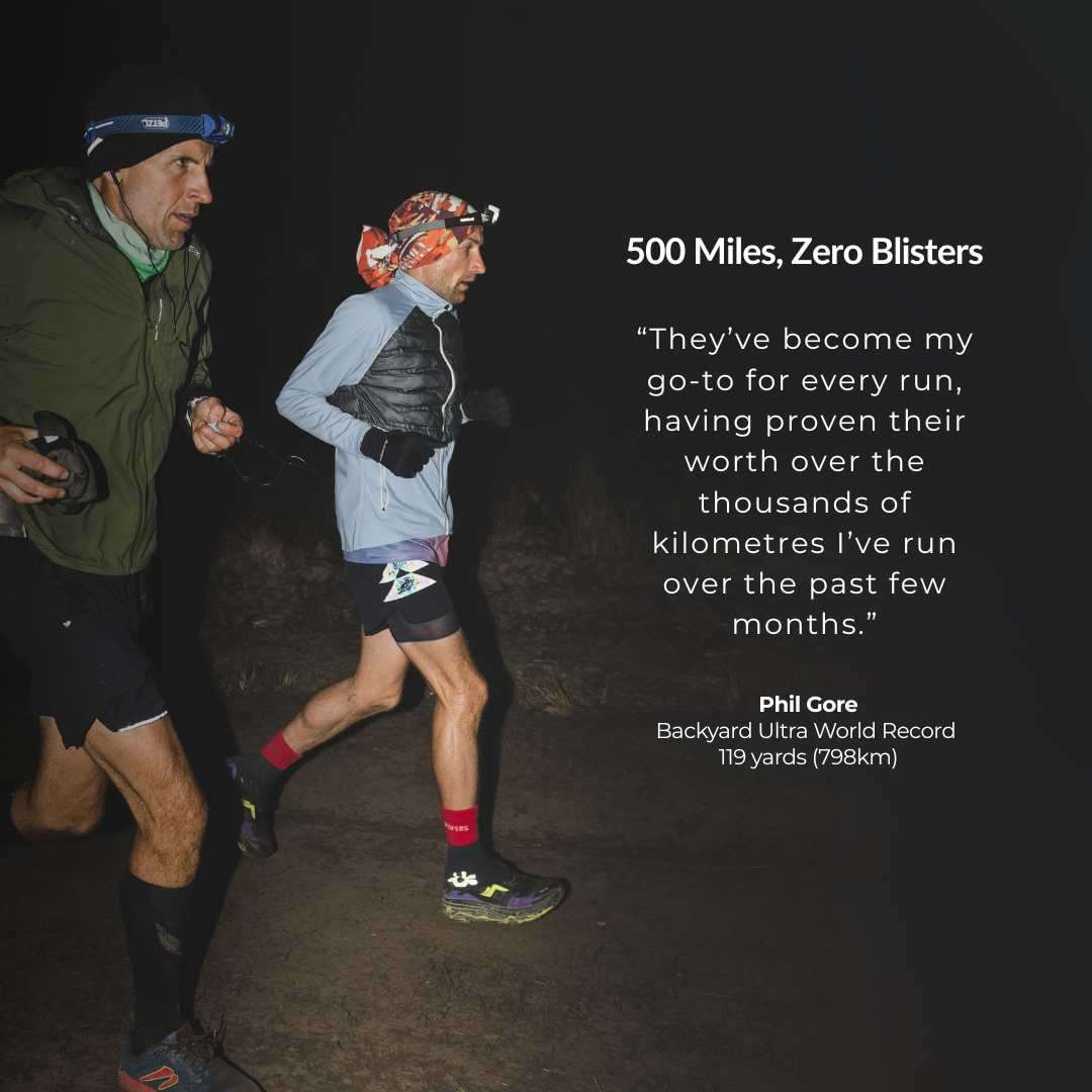 This limited-edition toe sock was co-designed with ultra-runner Phil Gore, who set the Backyard Ultra World Record this year: 119 loops, 798km, 5 days.