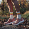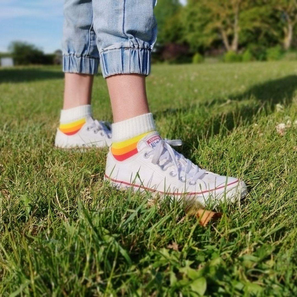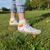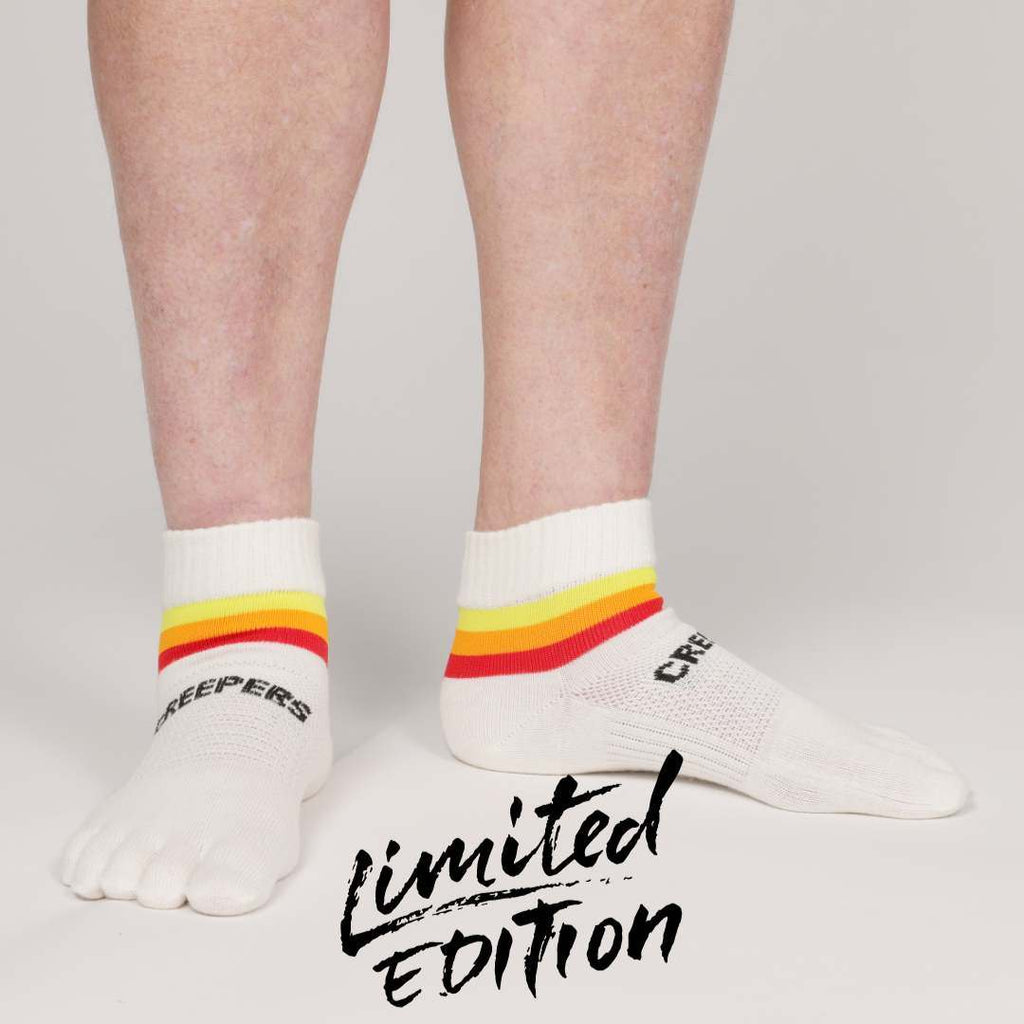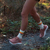 Another rare one. Bright, bold, and full of life, this release is available in Crew and Quarter Crew lengths (see images for reference). Pulling colors from the sunrise on a white background, these socks will have you blazing the trails in style and comfort.